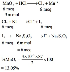 A 2.0 g sample containing MnO2 is treated with HCl liberating Cl2. The Cl2 gas is passed into a solution of KI and 60.0 mL of 0.1 M Na2S2O3 is required to titrate the liberated iodine. The percentage of MnO2 in the sample is _____________. (Nearest integer)