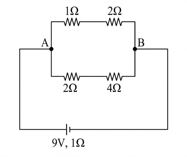 The heat generated in minute between points and in the given circuit, when a battery of with internal resistance of is connected across these points is __________ .