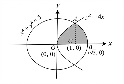 The parabola y^2=4x divides the area of the circle x^2+y^2=5 in two parts. The area of the smaller part is equal to:: Area of Bounded Region (Mathematics) | DivineJEE